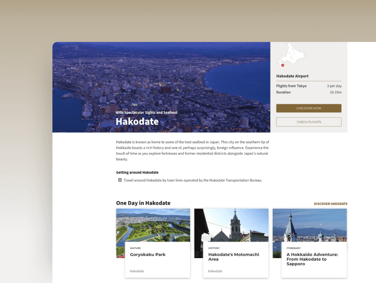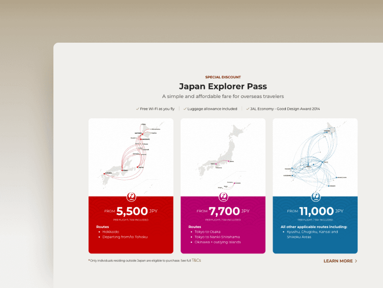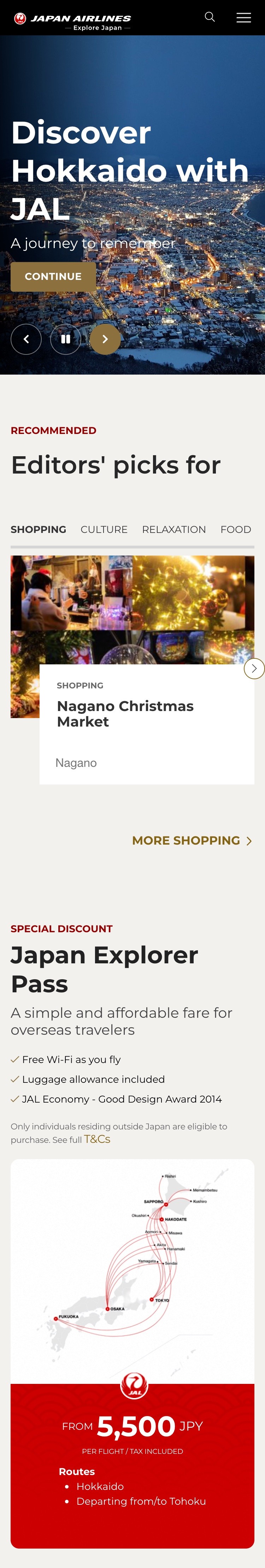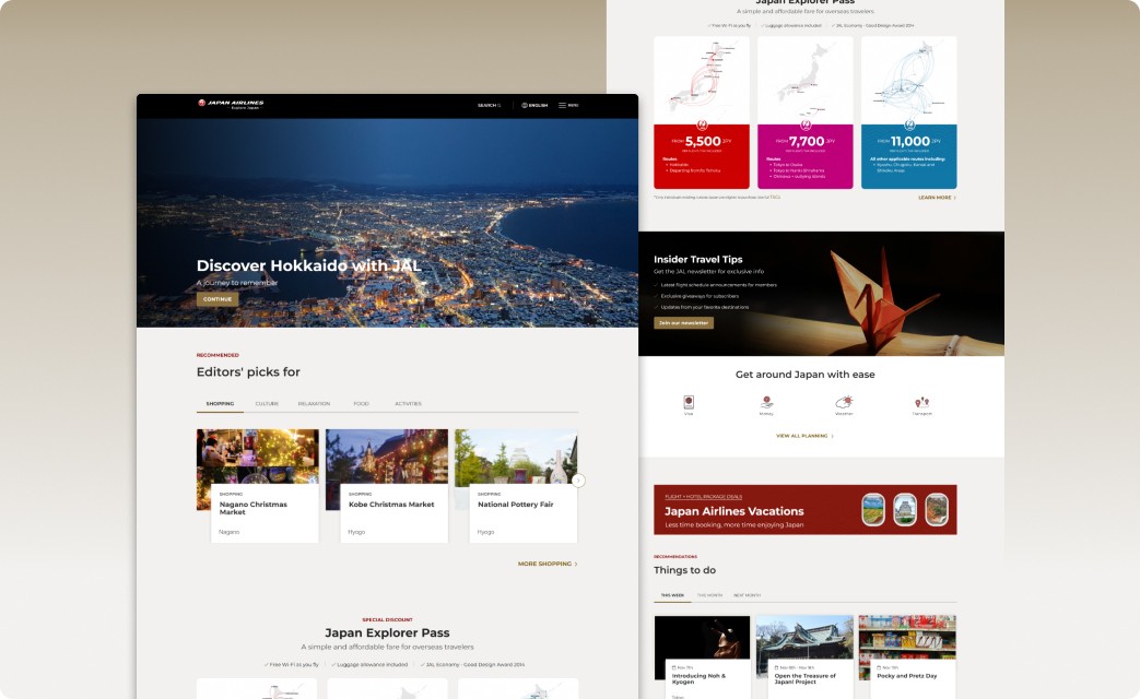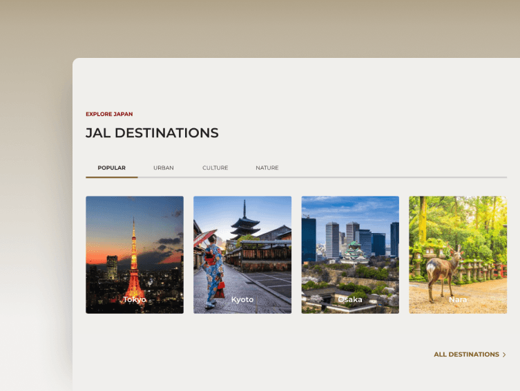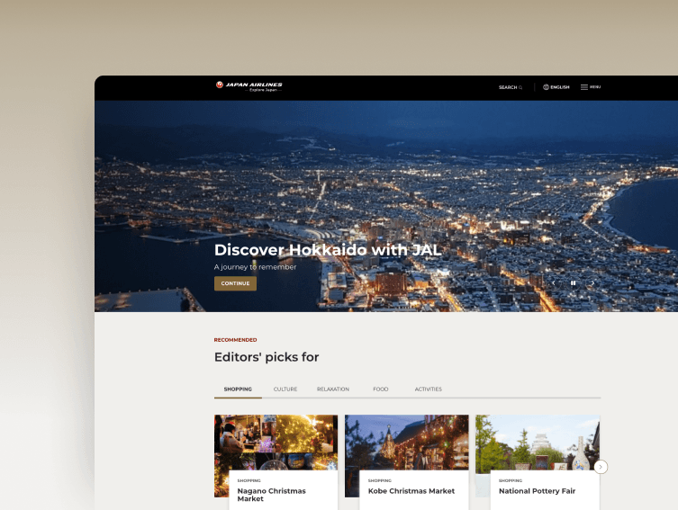 「Explore Japan」はJAL向けに作成された観光プロモーションウェブサイトで、JALの馴染み深いパワフルなブランディングとソリューションを、ジャパントラベルの広範な観光コンテンツのデータベースと組み合わせています。